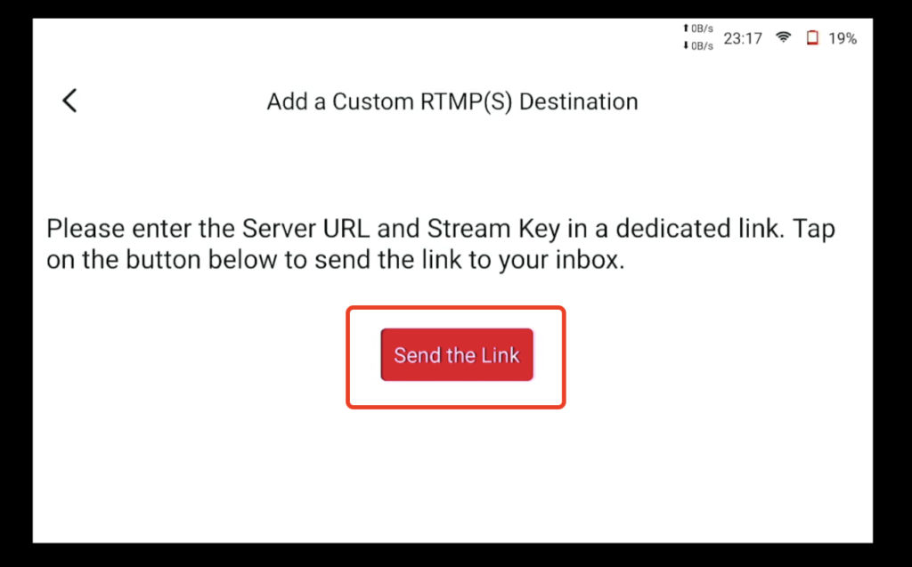 На екрані "Додати призначення Кастомного RTMP(S)" натисніть червону кнопку "Надіслати посилання"