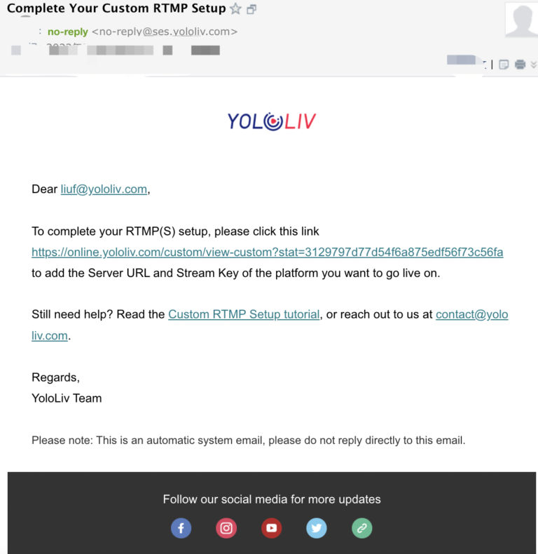 Перейдіть до своєї електронної пошти, знайдіть лист від "no-reply" з темою "Кастомний RTMP"
