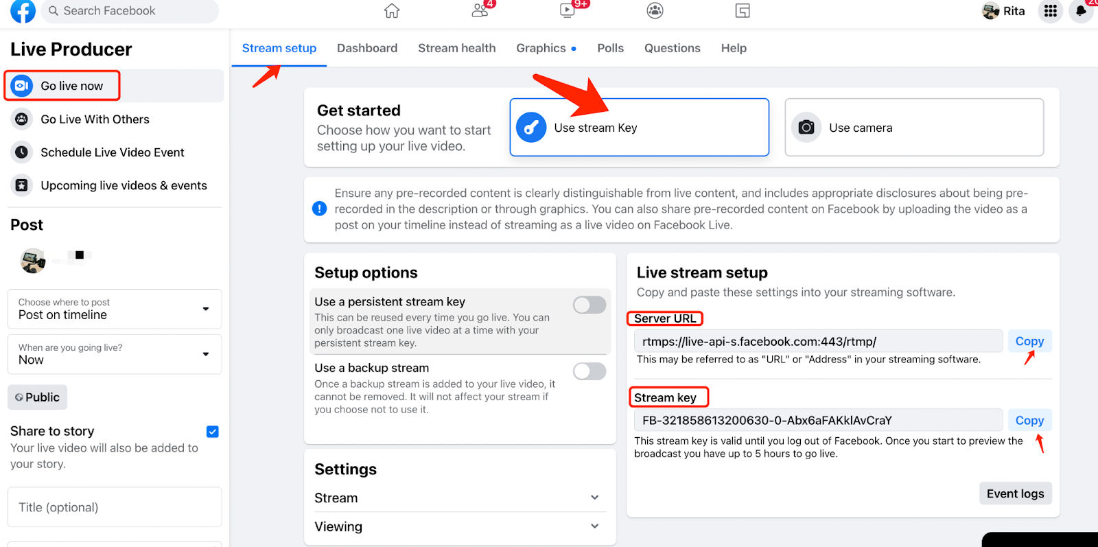 Перейдіть до своєї сторінки Facebook> знайдіть "Відео в прямому ефірі"> Увімкнути зараз> Налаштування трансляції> Використовувати ключ потоку.