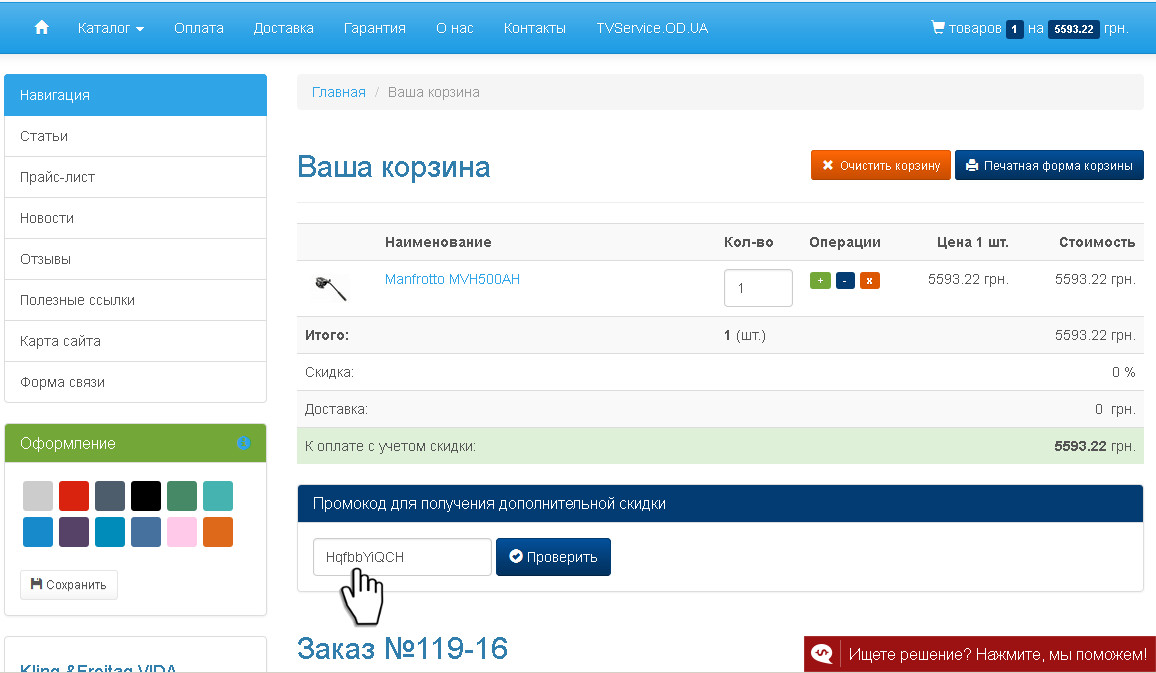 Щоб застосувати отриманий код, додайте вибрані вами товари до «Кошик» та переходьте до оформлення замовлення. У вікні оформлення під сумою замовлення ви побачите посилання "Ввести промо-код".