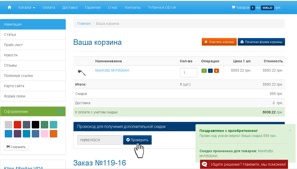 Натискання кнопки «Перевірити» запустить перевірку коректності промо-коду. Якщо код введено правильно, і він підходить до цієї категорії товарів, сайт видасть повідомлення про застосований промо-код, а вартість покупки зменшиться на відповідну знижку суму.
